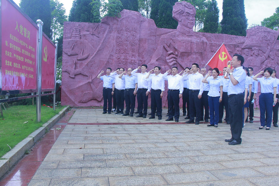 在夏明翰革命烈士雕像广场,党委书记、董事长邓来发和党委委员、副行长朱国良一起向夏明翰烈士敬献花篮,现场全体党员肃然站立向夏明翰烈士三鞠躬以示敬意。全体党员重温入党誓词,感受共产党人的初心与情怀,并对党和人民作出庄重承诺。