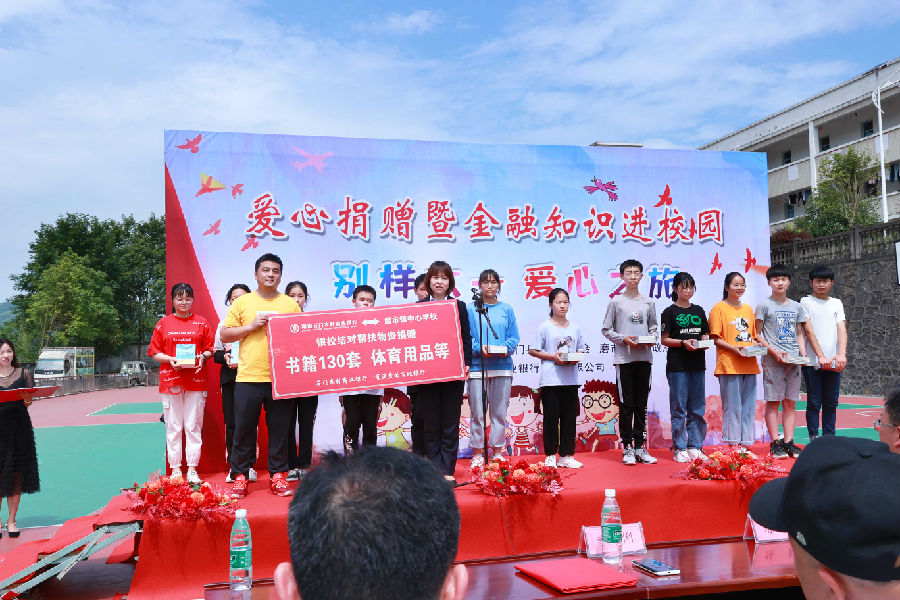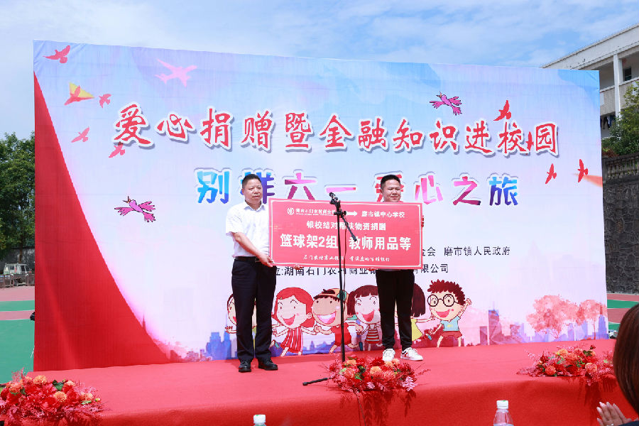 带着浓浓的深情,系着殷殷的祝福, 5月31日上午,石门农商银行党委书记、董事长邱表军,党委委员、副行长喻俐及相关部室、团委工作人员一行走进石门县磨市镇中心学校开展“别样六一 爱心之旅”——爱心捐赠暨金融知识进校园活动,深化“党建共创、普惠金融”专项行动,推进银校结对帮扶工作,助力精准扶贫,倾力支持家乡教育事业蓬勃发展。县教育基金会理事长袁黎明和磨市镇党委书记杨年国受邀参加活动。