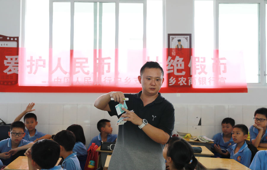 (人民银行宁乡支行工作人员为同学们讲解如何辨别真假人民币)