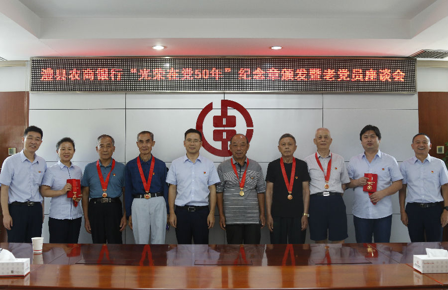 为热烈庆祝中国共产党建党100周年,进一步增强全体党员荣誉感、归属感和使命感,践行“客户至尊、员工至尚”的服务理念,7月12日上午,澧县农商银行邀请到部分退休老党员召开了座谈会,并为7名老党员颁发了“光荣在党50年”纪念章。