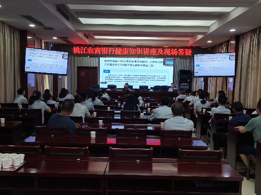 为了增强全行员工的健康保健意识,倡导科学文明健康的生活方式,提高全员身体素质,7月15日,桃江农商银行在总行七楼会议室举办健康知识讲座,本次讲座内容通过视频会议系统向各支行同步直播,机关、营业部、资产管理中心全体员工在主会场参加,各支行员工在分会场参加。讲座由长沙美年大健康首席健管专家、国家一级健康管理师张丽波教授主讲。