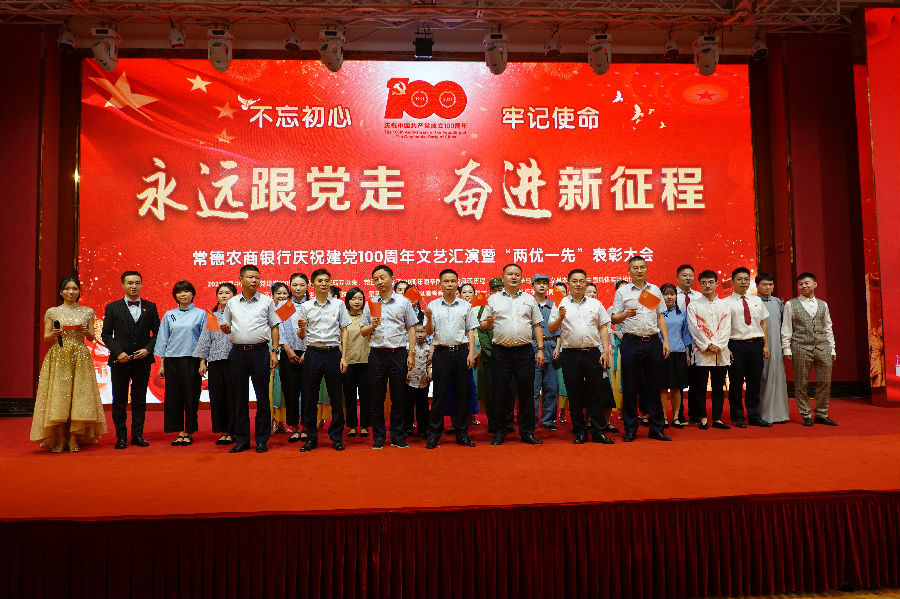 为隆重庆祝中国共产党成立100周年,7月22日晚,常德农商银行举办“永远跟党走 奋进新征程”庆祝建党100周年文艺汇演暨“两优一先”表彰大会,通过开展党内表彰、借助文艺汇演的形式,重现党的发展征程,重温党的光辉历史,更好地发挥党员的先进性和模范作用。总行班子成员,工会主席,协理员,机关各部门正、副总经理、总经理助理,一级支行班子成员及部室正、副经理,直属支行及二级支行正、副行长、行长助理,分理处主任、“两优一先”获奖代表、退休党员代表,共230人参加活动。