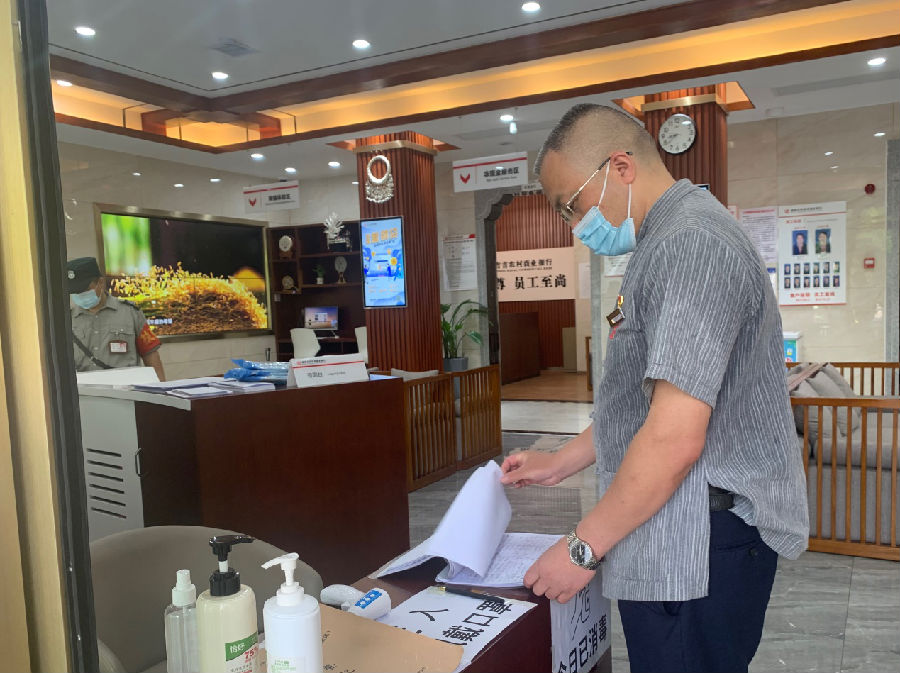 在各项工作有条不紊进行的间隙,陈长云定时到营业间检查防疫,查漏补缺,确保防疫意识不松懈。炎炎夏日,衣服被汗湿了一次又一次,衣服上的一片片汗渍印证着一个共产党员的责任担当!