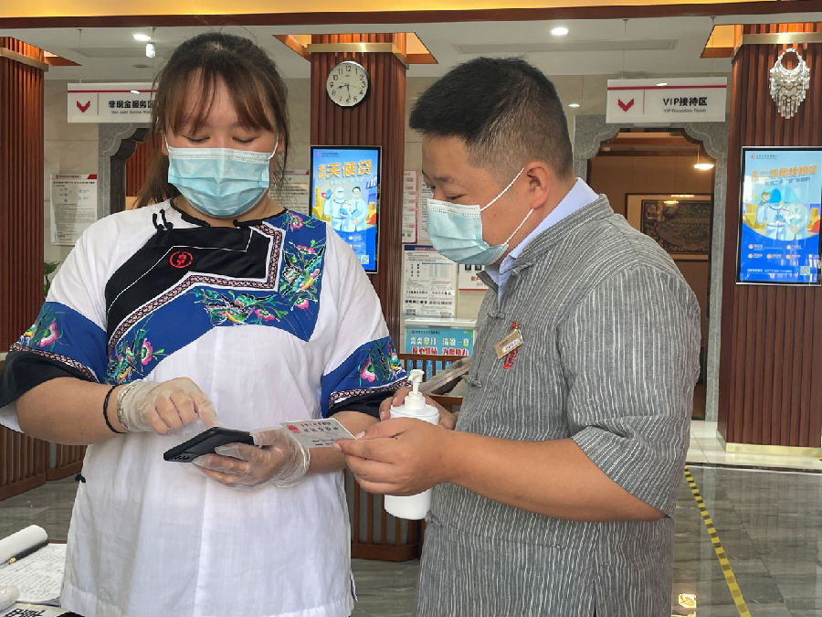 对于营业场所的到访客户,疫情期间更侧重于客户关怀和细节,时刻提升着银行的温度。乾州支行在营业大厅内贴出“网点已消毒”“现金已消毒”的标识,在柜台上及自助设备上为客户备好免洗手消毒液。对到访客户,先由大堂经理量好体温,做好登记,分类引导,问清需求,尽量减少客户在营业场所内的逗留时间。对防护措施没有做到位的客户,给其免费提供口罩,告知其出门特别是来金融网点必须带口罩的重要性。对不会查验健康码、行程码的老年客户,大堂经理们会用自己的手机帮客户查验,确定进出营业间人员的健康。