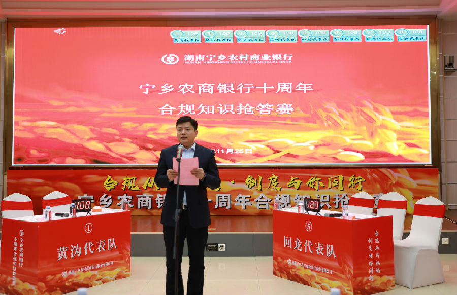 在10周年行庆来临之际,宁乡农商银行于11月25日晚19:00在总行六楼会议室举办了以“合规从我做起 制度与你同行”主题合规知识抢答赛。行党委书记、董事长刘鸿军,党委副书记、行长邵洁玉,纪委书记、监事长黄灵芝,党委委员、副行长李志平,党委委员范才勇出席合规知识抢答赛。