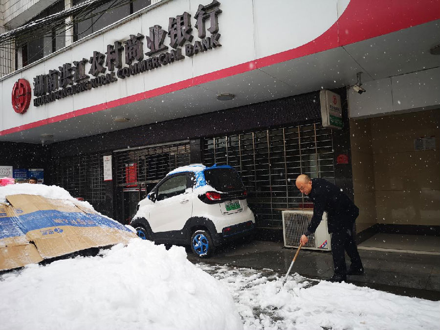 12月26日,沅河镇迎来降温降雪,房屋和树枝都裹上银装,道路也被积雪和泥泞所覆盖。为消除安全隐患,保障沅河支行紧急出入口通畅,沅河支行在行长左涛的带领下开展扫雪除冰活动。