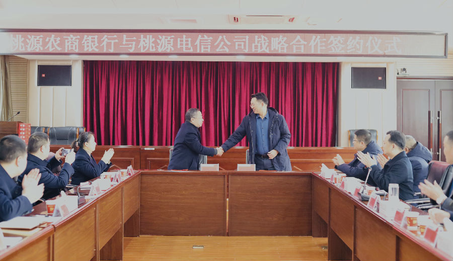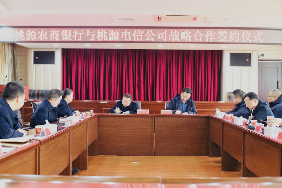 1月13日,桃源农商银行与桃源电信公司举行战略合作协议签约仪式,桃源电信公司总经理童志刚,副总经理薛君、文君宇,桃源农商银行董事长唐国,行长金新义,副行长周海军及双方相关部室负责人出席签约仪式。
