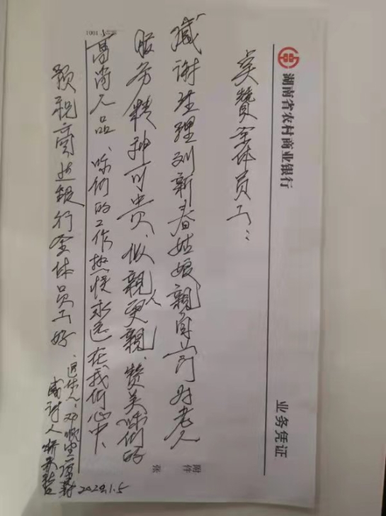 一元复始,万象更新,辞旧迎新时,长沙农商银行收到了一封来自八旬老人的感谢信,言语真挚,表达出对长沙农商银行优质服务工作的高度赞扬和衷心感谢!