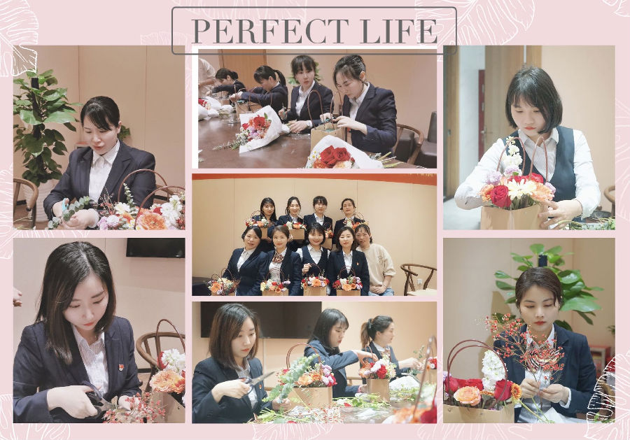 活动在花的芬芳中拉开帷幕。花艺老师讲述了花艺沙龙的由来、主要花材和色系搭配之后,并给大家传授了插花配置的八种方法,即上轻下重、上散下聚、高低错落、疏密有致、俯仰呼应、虚实结合、动静相宜和亦庄亦谐。同时围绕花艺层次感、花艺摆件进行现场演示。在老师的指导和讲解下,大家兴趣盎然,精挑细剪,将一朵朵明媚的鲜花错落有致地搭配在了一起,不一会儿一个个美丽的花篮就新鲜“出炉”。