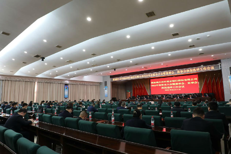 3月11日,桃江农商银行在县政府附属三楼会议室成功召开2022年度股东大会暨董事会、监事会换届选举工作会议。会议由该行党委书记、董事长黎君辉主持,行党委成员、股东、部室经理、支行行长共130余人参加会议。省联社益阳办事处党组书记、主任沈中心,县委常委、常务副县长李丰,副处级干部周里忠出席会议。