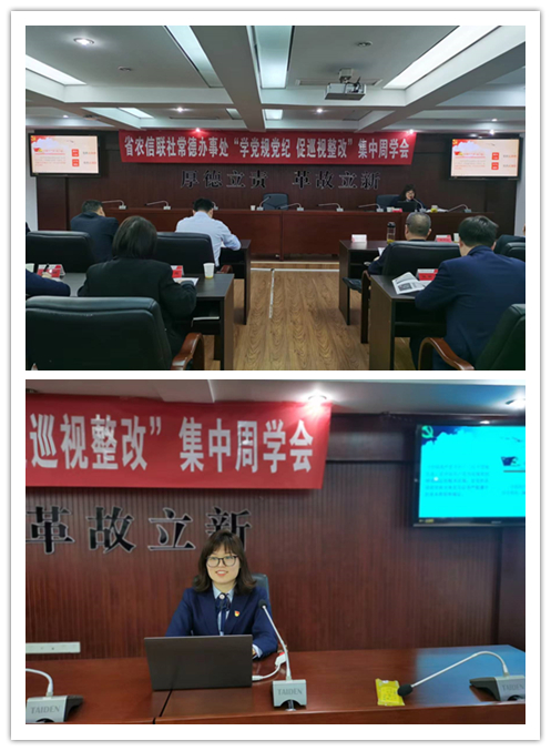 为深入学习贯彻习近平新时代中国特色社会主义思想和习近平关于巡视工作重要讲话精神,持续深入推进党的思想政治建设和作风建设,教育引导全体党员干部不断增强“四个意识”,坚定“四个自信”。近日,省联社常德办事处通过集中研学、潜心自学、党员讲学、以考验学“四学并举”,扎实开展“学党规党纪,促巡视整改”专题学习活动。