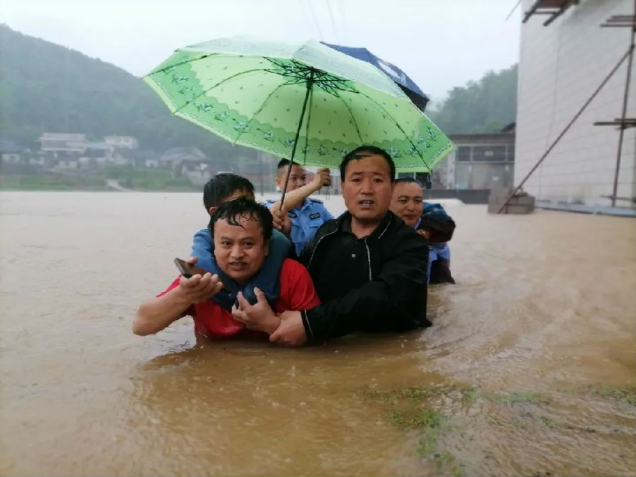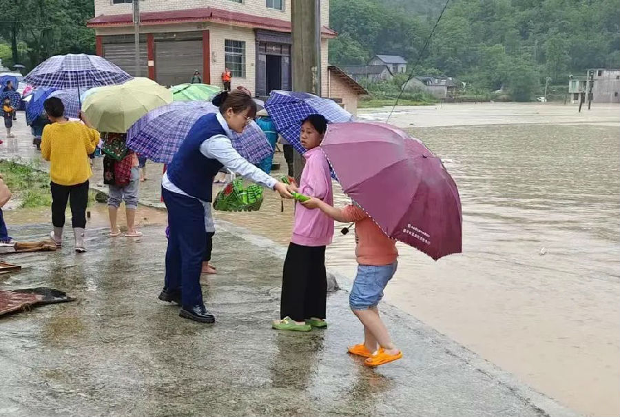 图为雅酉支行客户经理隆森(黄色雨衣人员)参与转移群众