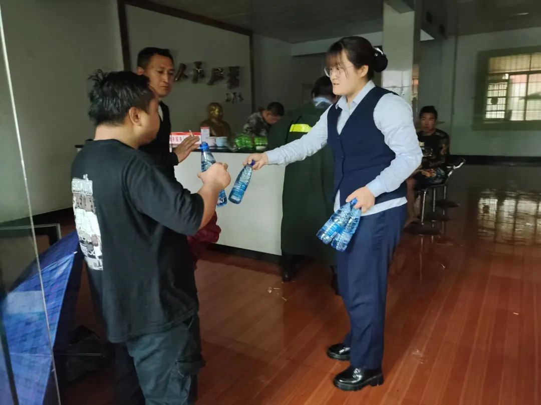图为雅酉支行主管会计柳梦琴发放矿泉水