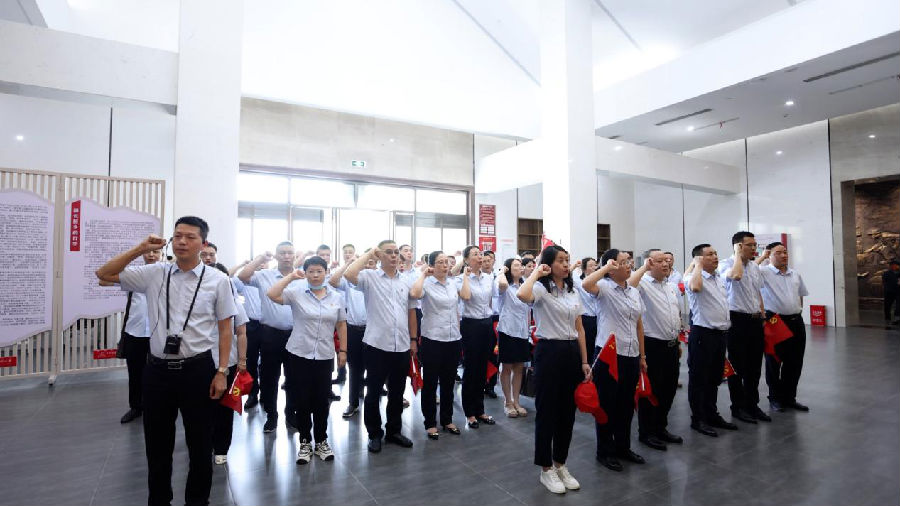 在平江起义纪念馆内,大家观看了陈列馆的实物、照片以及相关影片等等,每张照片和每段解说都在叙述着革命的故事。往日的喧嚣和热血,在凝重、肃穆的气氛中,大家对中国革命先烈的敬畏之情油然而生。面对鲜红的党旗,机关支部的党员们高举右手,齐声庄严宣誓,入党誓词句句铿锵,字字千钧,把对党的忠诚化为勇担使命的强大动力。