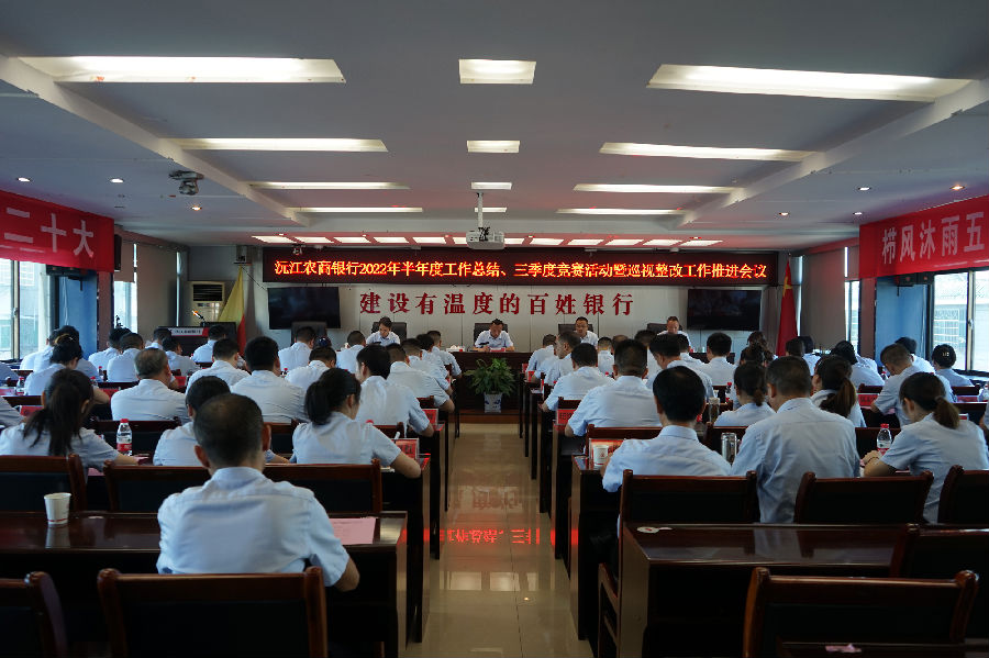 为传达和学习省联社半年度工作会议精神,全面总结2022年上半年工作开展情况,动员全行员工拼搏奋进、真抓实干,推动各项工作取得新成绩、实现新突破。7月13日上午,沅江农商银行在总行六楼会议室召开2022年半年度工作总结、三季度劳动竞赛暨巡视整改工作推进会议,总行班子成员,各部门、支行、中心正副职及先进个人共计近80人参加会议。会议由党委副书记、行长宋海强主持。