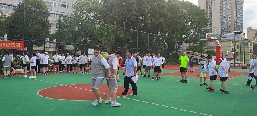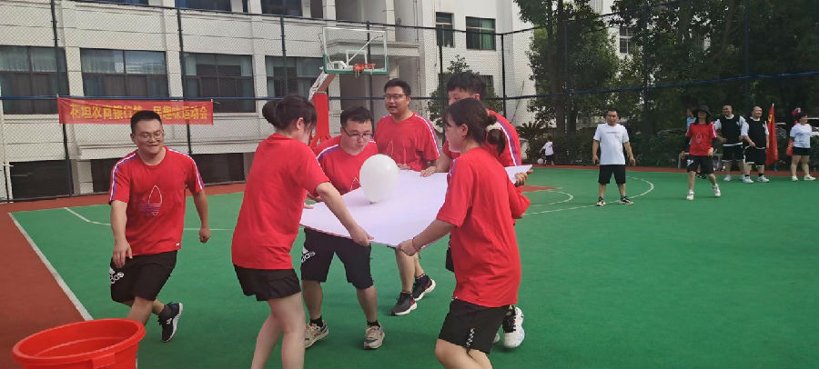 此次运动会设置定点投篮、抬气球、背靠背运球、齐心协力、拔河等5个比赛项目。定点投篮中,10个小组分为5个场次,每个组员连续投篮1分钟。4人1组的抬气球比赛中,队员们同心协力用纸板将气球运到指定地点。一个个气球象征着每个队伍胜利的果实,激励着大家勇往直前。2个队员背靠背合作把球搬运到指定地点,极大地考验配合度。齐心协力项目中,4个队员一块绑着小腿迈着整齐划一的步伐,用完美的默契度向终点线冲去。最后一项是拔河比赛,对抗十分激烈,在炎热的夏日赛场上大家挥洒汗水,激情澎湃。