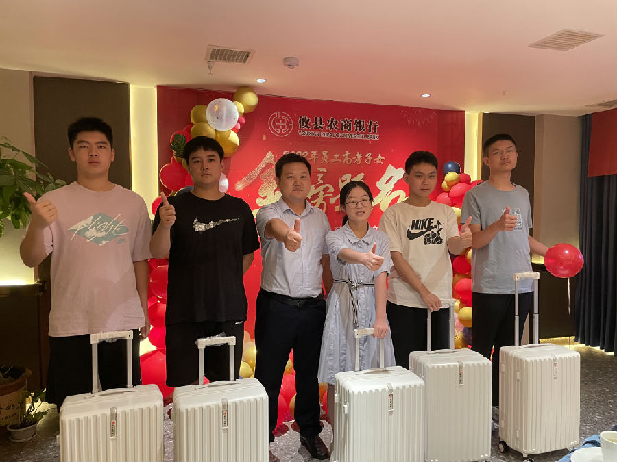 最后,攸县农商银行向考入大学的员工子女颁发了奖学金,赠送了拉杆箱,并合影留念。举办员工子女高考集体升学礼是攸县农商银行加大对员工关心关爱力度的又一有力举措,为员工及子女搭建了沟通交流的平台,加深了员工对单位的感情,推动全行企业文化建设再迈新台阶。