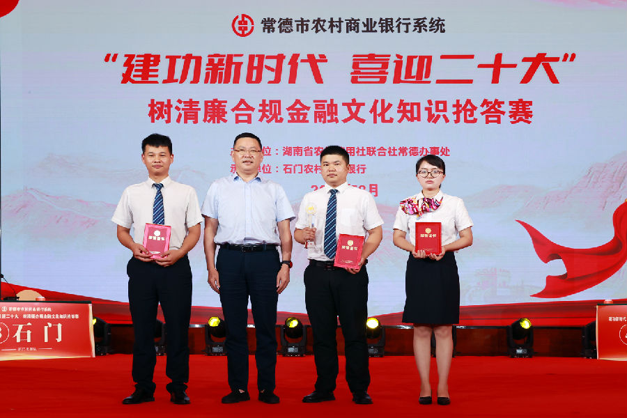 近日,石门农商银行代表队在常德市清廉合规金融文化知识抢答赛中以400分的好成绩夺得冠军。