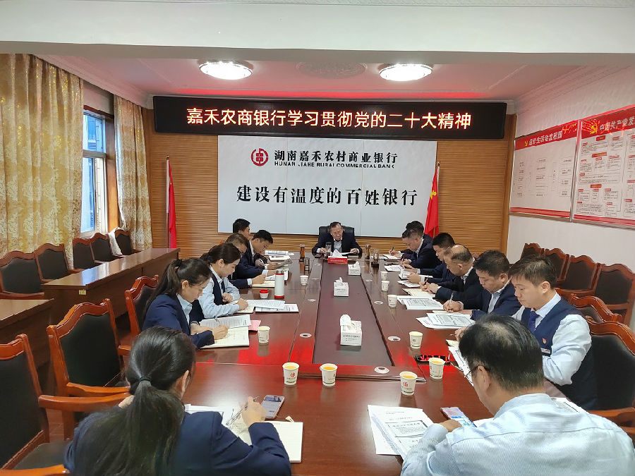 10月31日上午9点,嘉禾农商银行在三楼会议室召开党委(扩大)会议,传达学习党的二十大会议精神,研究部署全行学习贯彻党的二十大会议精神的宣传工作。总行党委班子成员、各部室负责人参加会议。