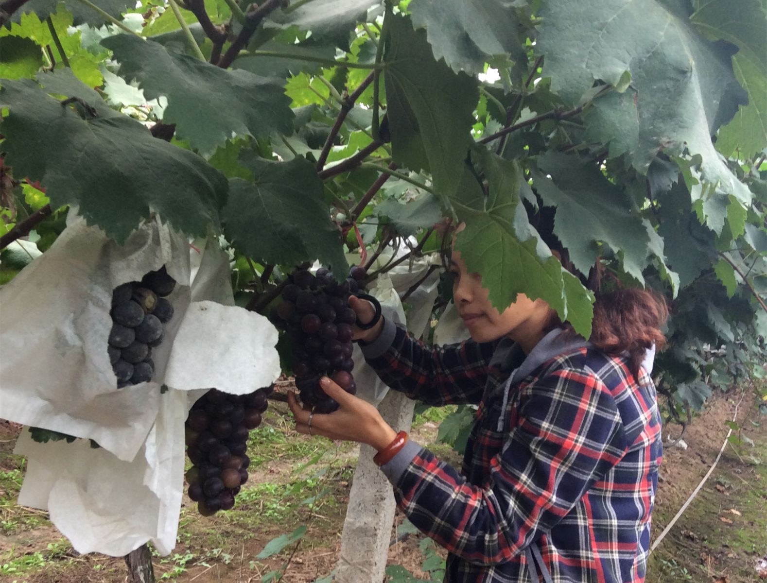 老余的妻子在自家的葡萄园里采摘熟透的葡萄