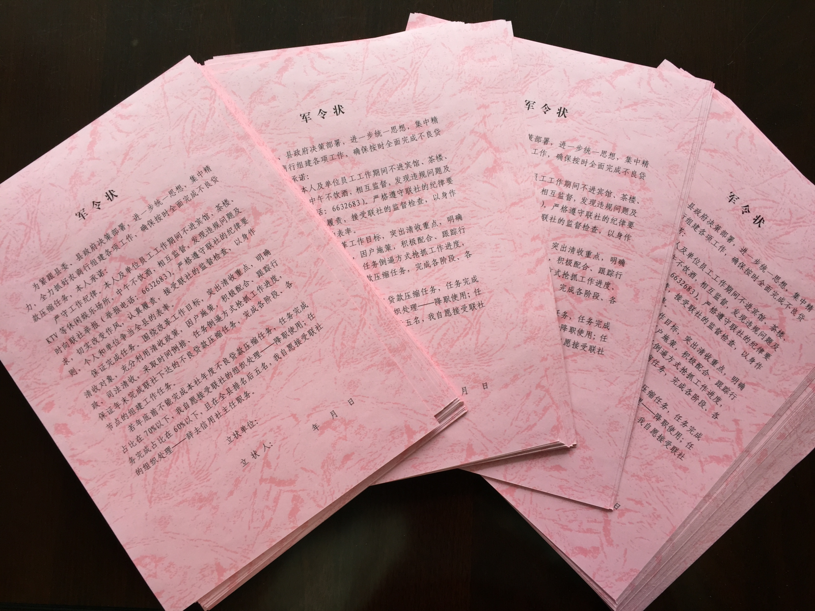“若年底前不能完成本社年度不良贷款压缩任务,任务完成占比在70%以下,我自愿接受联社的组织处理——降职使用;任务完成占比在60%以下,且在全县排名后五名,我自愿接受联社的组织处理——辞去信用社主任职务。”
