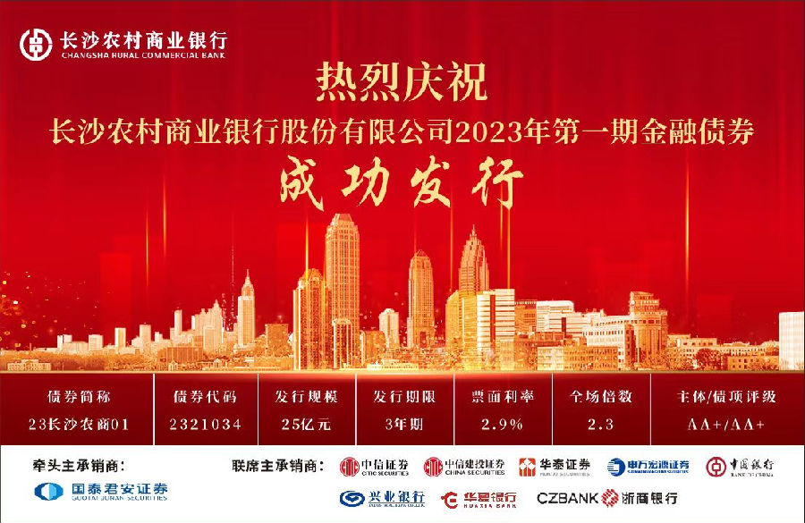 近日,经过四轮紧张激烈投标,长沙农商银行成功发行25亿元2023年首期金融债券,发行利率2.9%。本次债券发行市场认购热情高涨,全国近百家各类型金融机构参与投标,全场倍数达到2.3倍。