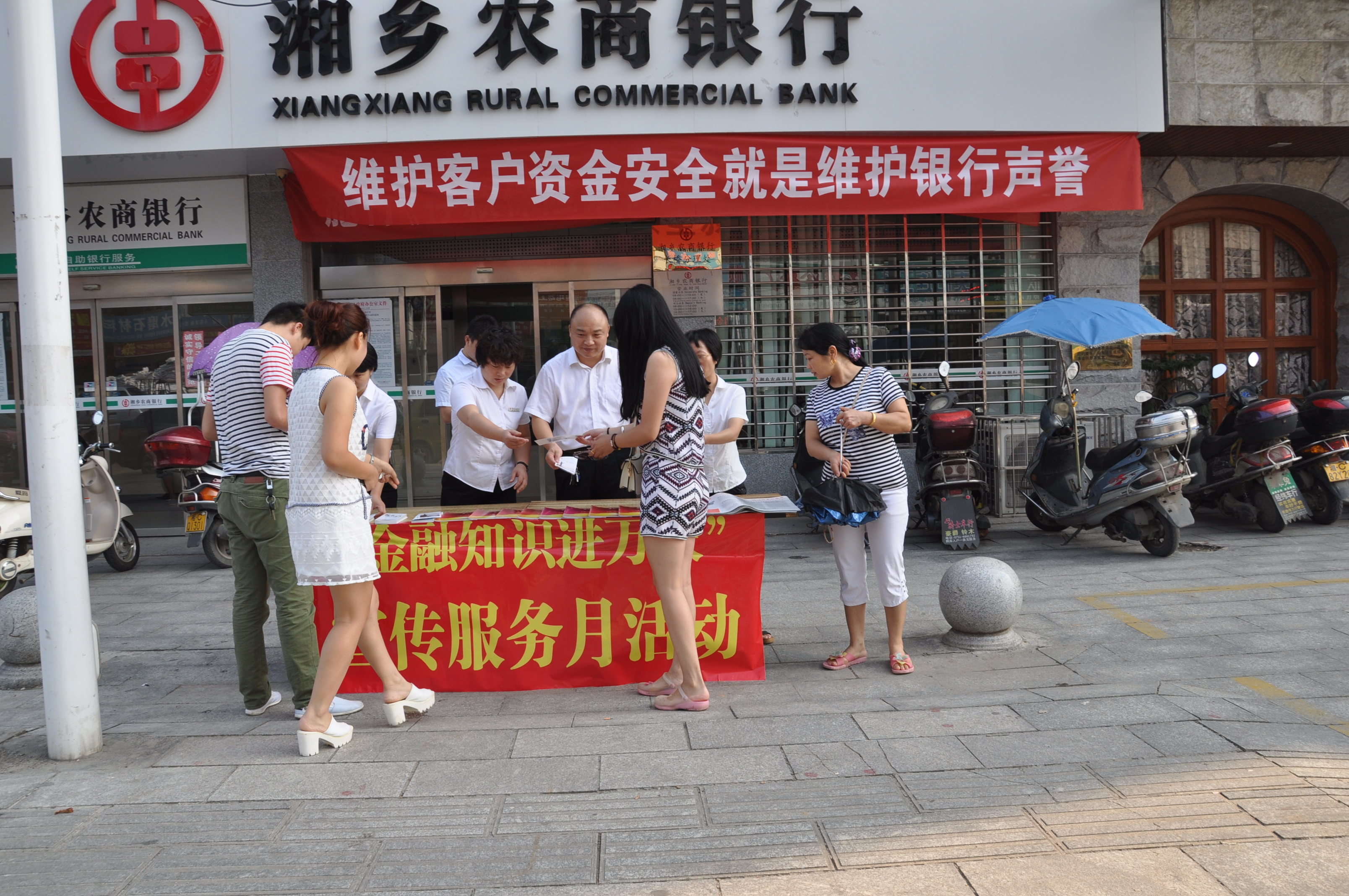 为增强社会公众金融素质,确保公众资金安全,根据省联社《关于开展2015年“金融知识进万家”宣传服务月活动的通知》精神,9月10日,湘乡农商银行新湘路支行走进湘乡市建材市场,向商户们进行消费者权益保护、安全用卡、非法集资等知识讲解和宣传。
