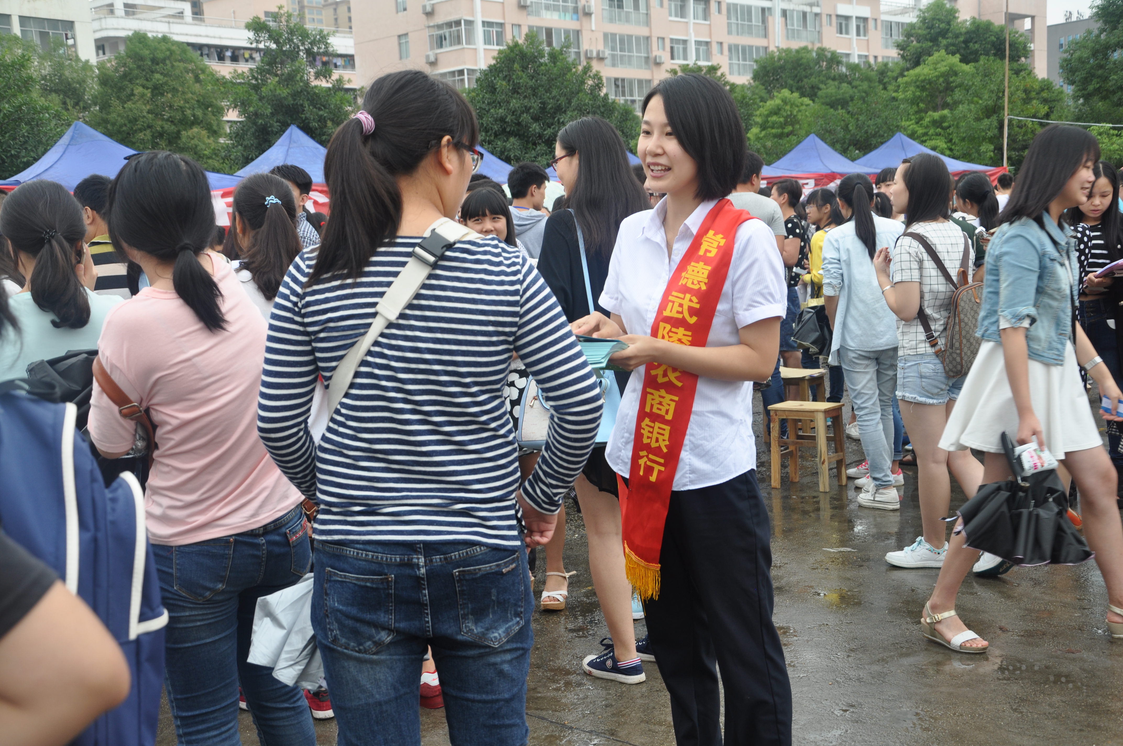 “同学们,欢迎入学!有兴趣了解一下金融方面的知识吗?”同样年轻的面孔,同样明媚的声音,纯净的笑容让大家备感亲切。正在排队办理入学手续的同学和家长们不由好奇地接过宣传队员随手递来的宣传资料。在拥挤的报名队伍中,宣传队员们手持宣传资料,热情地向大家介绍手机银行、网上银行、微信银行、网络支付风险防范、个人征信等金融知识,认真指导大家进行“三湘征信”、“湖南农信微银行”微信号二维码扫描……