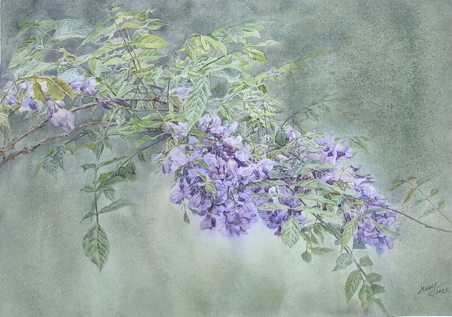 《紫云》水彩画聚焦紫藤,以浅灰绿铺陈背景,营造出宁静悠远的氛围,如春日清晨的柔和天光。藤蔓自然垂落,舒展随性,淡紫色花簇层次细腻,花瓣晕染间,藏着含蓄温柔。绿叶脉络清晰,与繁花相衬,尽显生机。右下角 “2025” 的标注,是创作时间的留存,将紫藤花开的瞬间,凝成永恒画面,寓意紫气东来,观者目光触及,似能踏入这静谧花境,感受自然与艺术交融的恬淡美好 。