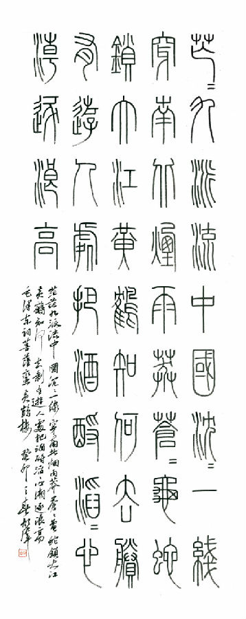 这幅篆书作品书写的是毛泽东词《菩萨蛮・黄鹤楼》。篆书线条婉转流畅,结体严谨规整,展现古朴典雅之美。以独特的篆法演绎经典词作,在笔墨间传递出历史厚重与诗意豪情,展现了篆书艺术与革命诗词融合的独特韵味,是书法艺术对经典文学的精彩诠释 。