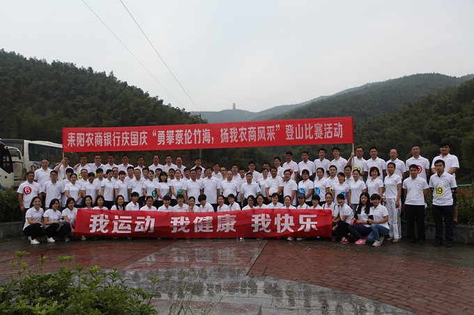 在这秋意浓浓的美好季节里,为庆祝中华人民共和国成立66周年,活跃职工业余文化生活,缓解职工工作、生活压力,营造“我运动、我健康、我快乐”的全民健身氛围,培育职工的团队意识、拼搏精神,进一步增强企业的凝聚力与向心力,10月10日,耒阳农商银行组织职工在耒阳蔡伦竹海开展了庆国庆“勇攀蔡伦竹海,扬我农商风采”登山比赛活动,活动得到了广大职工的积极参与。