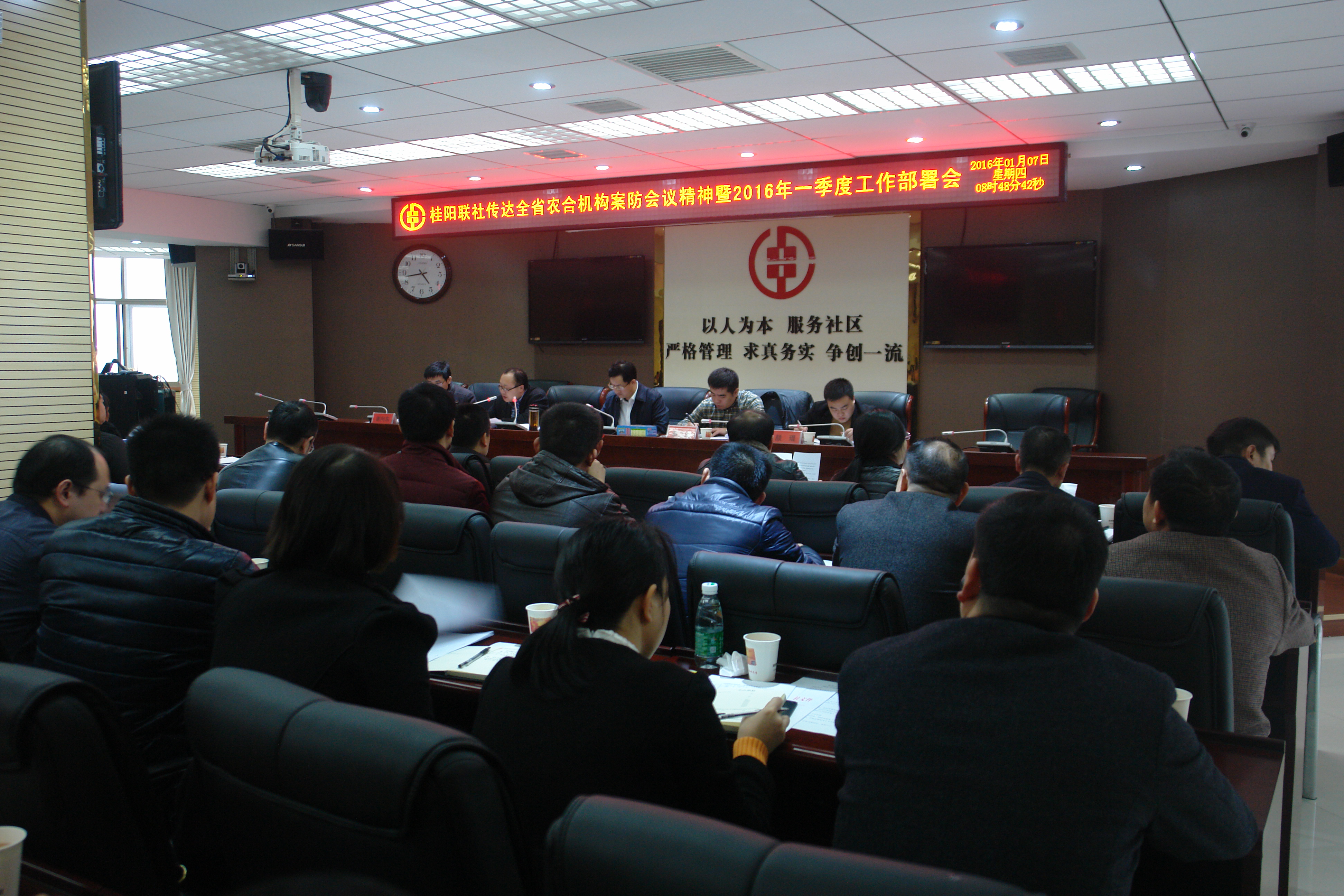 1月7日,桂阳联社组织召开传达全省农合机构案防会议精神暨2016年一季度工作部署会议,联社班子成员、主任助理、机关部室负责人、各基层信用社主任等共60余人参会。会议传达学习了2015年12月25日省联社李勤主任《在全省农村信用合作金融机构案件部署防控治理(电视电话)会议上的讲话》和刘云山《在部分省市“三严三实”专题教育工作座谈会上的讲话》精神,并结合桂阳联社当前实际情况对案件防控和2016年一季度工作进行了部署。